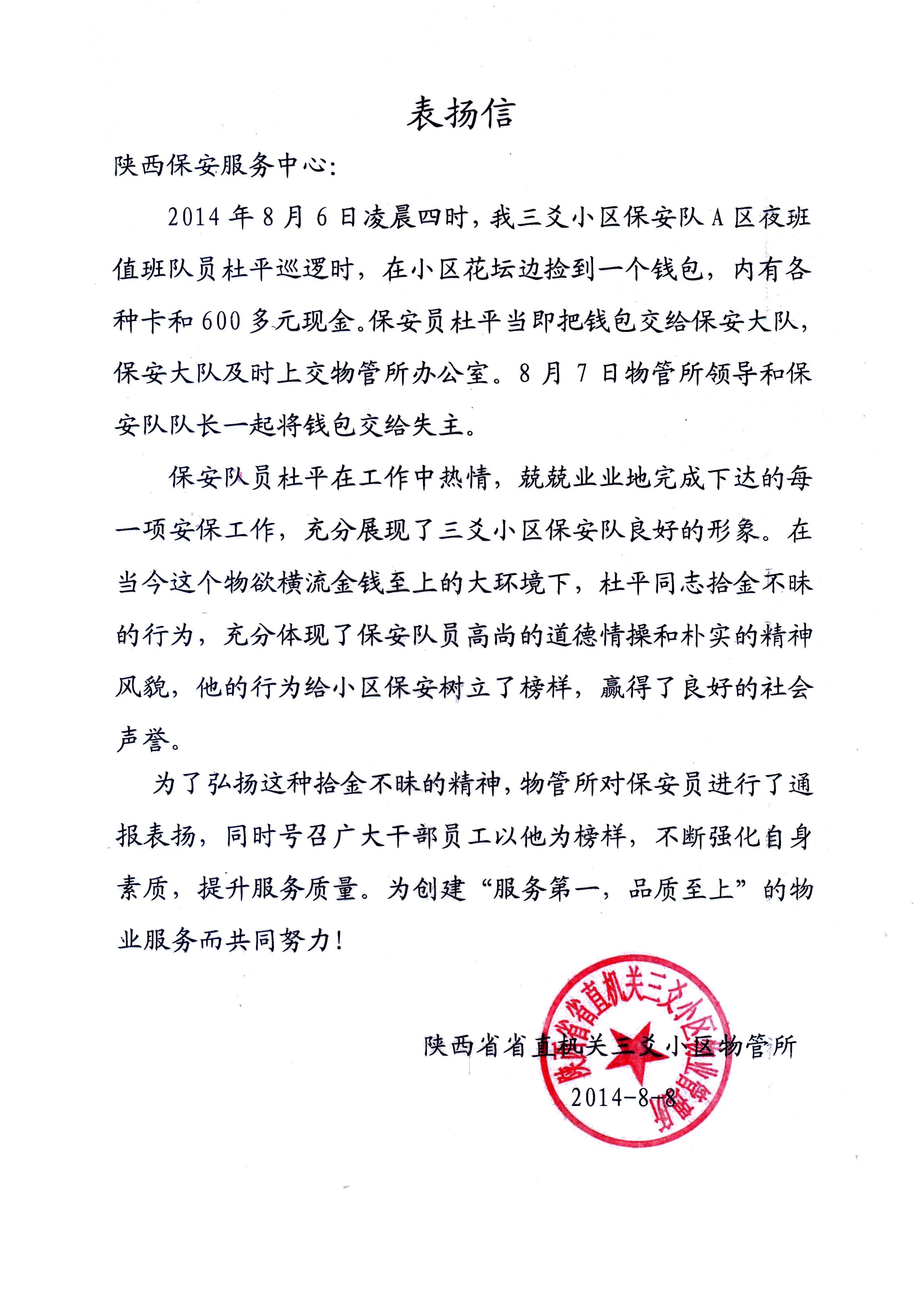 我中心四大队驻省直机关三爻小区分队队员杜平同志拾金不昧受到客户单位通报表扬