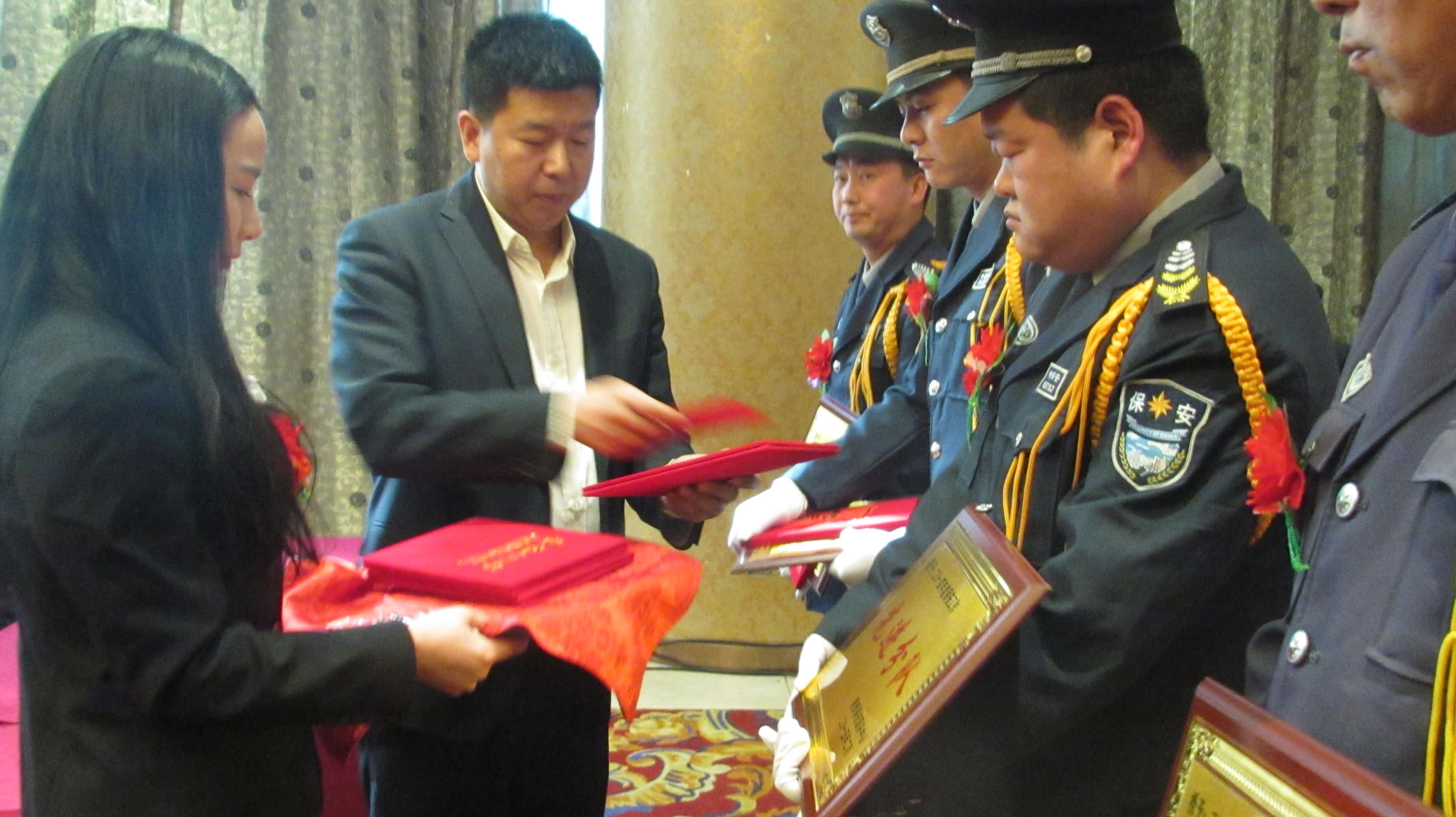 联络员李儒亮宣布2014年度表彰决定,宣读过去一年中心评选的优秀部门经理两名、先进大队长两名、优秀员工三名、先进分队11个、先进个人126人的获奖名单。并由董事长张金龙为先进分队代表颁发奖牌、荣誉证书和奖金;由联络员李儒亮为先进大队长颁发荣誉证书和奖金;由陕西省治安局协理陈西平为先进员工颁发荣誉证书和奖金;由陕西省治安局保安处处长金博学为优秀部门经理颁发荣誉证书和奖金。员工代表阮晓林大队长上台发言,并作工作总结;获奖代表陈强同志上台发言,并作工作总结。
