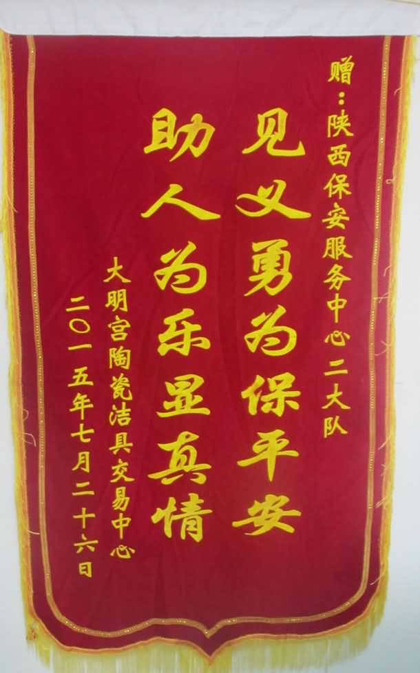 2015年7月10日下午13时45分左右,在大明宫陶瓷洁具交易中心商品楼,值班保安在巡逻过程中,发现一名男子形迹可疑,神情慌张,于是控制住进行盘问。就在此时,业主报告店中丢失钱包和手机。此时,可疑男子见事态暴露,如实交出所盗物品,值班保安立即拨打“110”报警,并将其控制,民警赶赴现场后将小偷移交派出所,同时将被盗物品归还业主。业主当场要以现金的方式表示感谢,被我中心保安员婉言谢绝。这种时刻警惕,心系居民的责任心得到了业主和客户单位的一致好评。并于2015年7月26日将一面写着“见义勇为保平安,助人为乐显真情”的锦旗送到我中心领导手中,以表谢意。