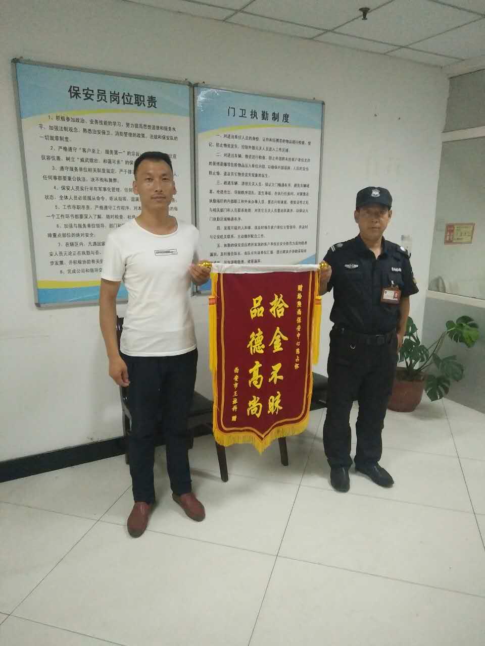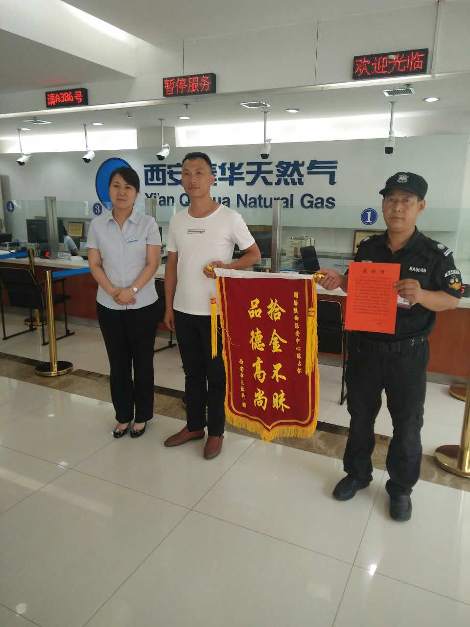 2017年7月4日上午11:30左右,一名男子在凤城一路的秦华天然气服务大厅购买天然气时,将手提包顺手放在了椅子上,购买完成后接了个电话便离去了,这时手提包被值班的保安员陈占怀发现了,便将包收了起来交给了我公司派驻该点的保安队长。不久后,这名男子意识到自己的手提包忘带了,便立即返回大厅寻找,陈占怀将该男子带到保安值班室,待保安队长对男子的身份进行核实后便将失物归还。这时,该男子发现里面的三万多元现金及十多万的票据一张未少,顿时男子被陈占怀拾金不昧的当代“雷锋精神”所打动。事后,送来锦旗与感谢信对陈占怀的高尚品德表示衷心感谢。 |