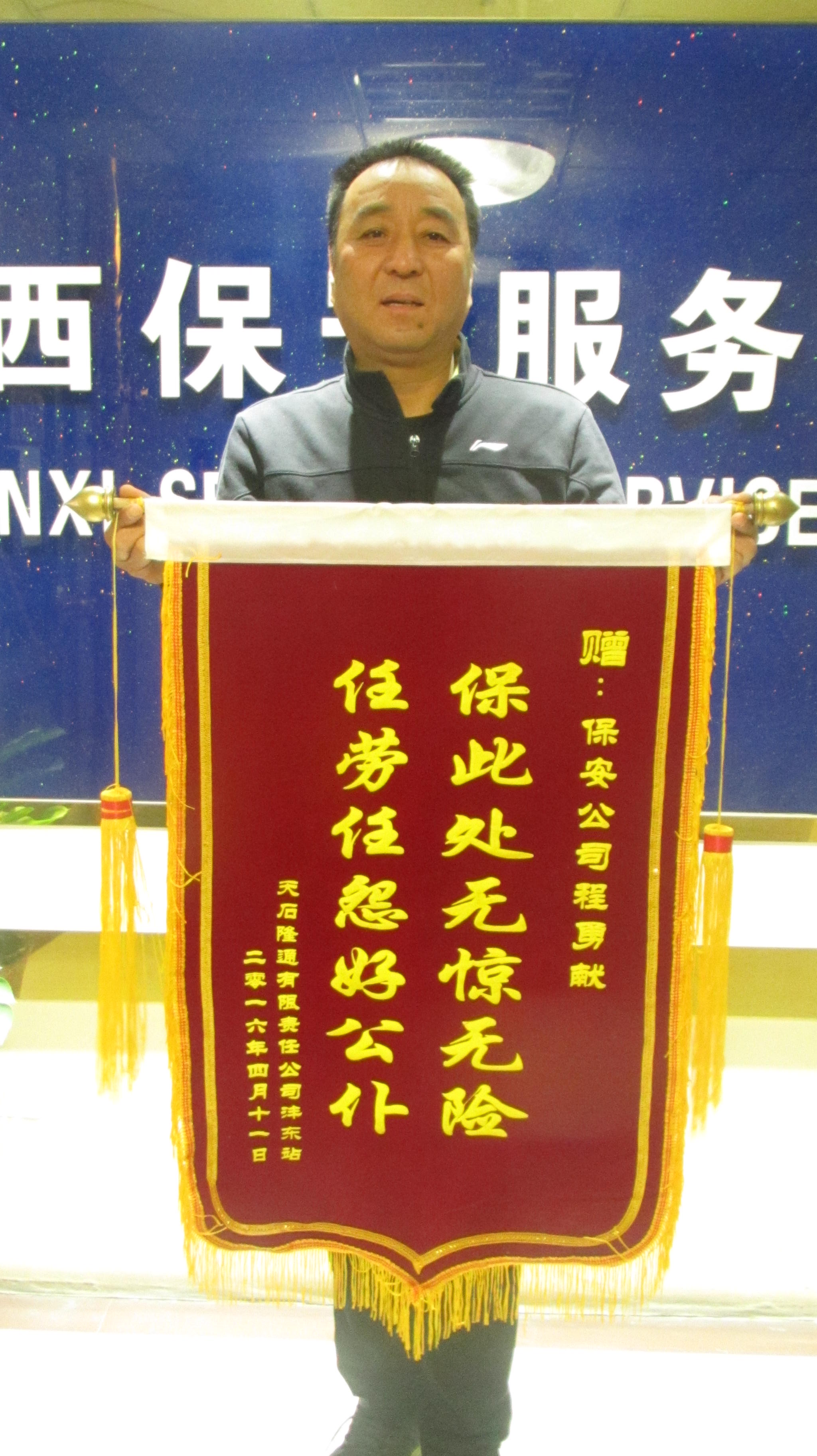 天石隆通是我公司一大队的执勤点,也是合作了多年的老客户,服务期间我们的保安队长思想觉悟高,工作责任心强,处理问题迅速高效;保安队员尽职尽责,认真负责。我公司保安队员的服务态度赢得了天石隆通有限公司的一致好评。该公司负责人于二零一六年四月十一日,为我陕西龙翔保安服务有限公司送来了一面书写“保此处无惊无险,任劳任怨好公仆”的锦旗,并表示对我公司的服务高度满意。该分队的积极表现和其取得的成绩也为我陕西龙翔保安服务有限公司的赢得了声誉。