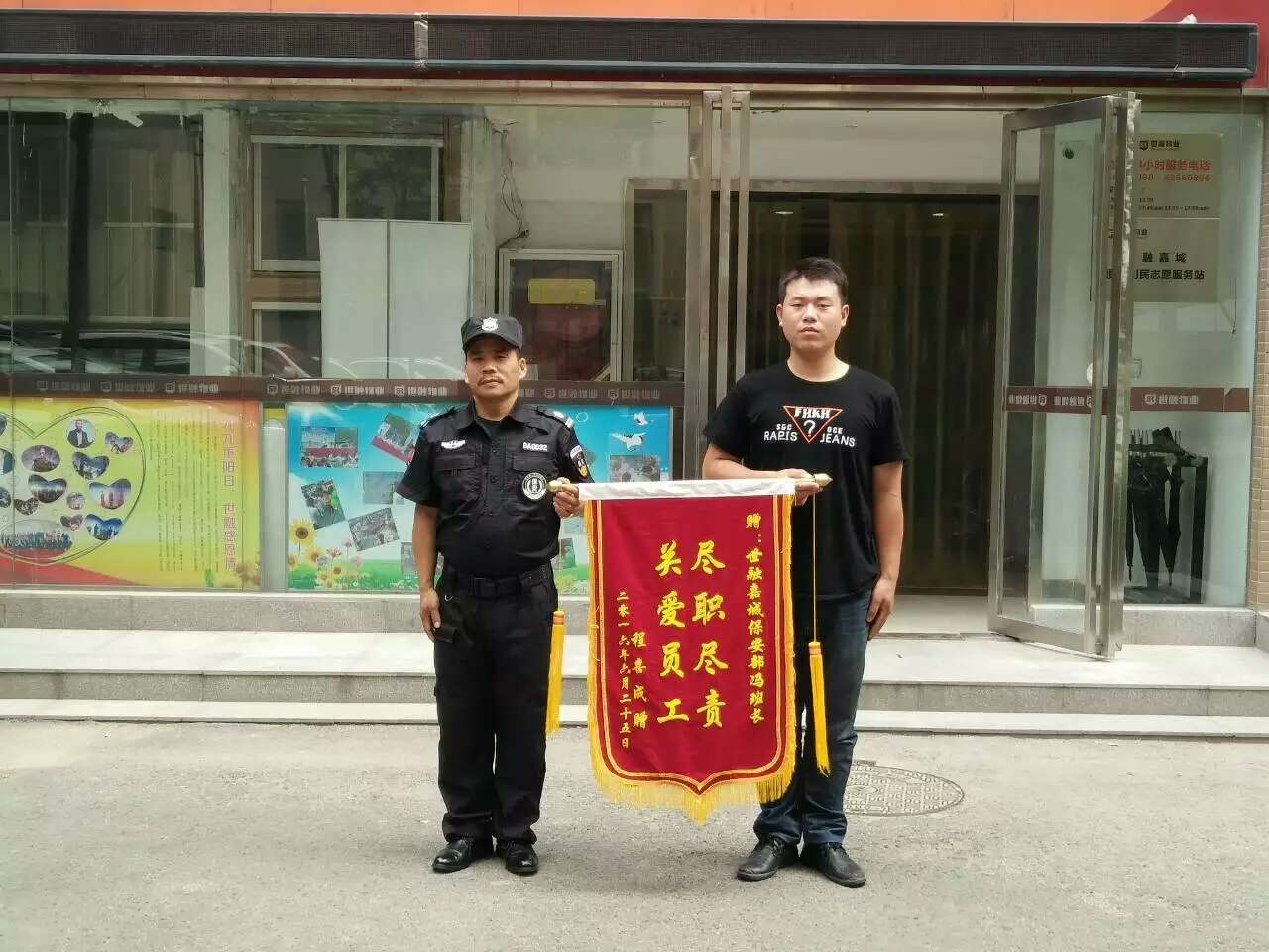 我中心派驻世融嘉城的保安员班长冯文兴自从带班以来,工作尽职尽责,时刻关心队员的生活、工作情况,设身处地的为队员解决生活和工作中的困难。保安员程喜成心中非常感激冯文兴班长对他工作生活中的帮助,程喜成因家中有事正常离职后,特将一面写着“尽职尽责,关爱员工”的锦旗送到冯文兴班长手中,以表感谢!冯文兴班长的这种兢兢业业的工作态度和勇于奉献的忘我精神不仅为中心增添光彩,也是个人良好修养的一种体现,值得中心全体员工向其学习。