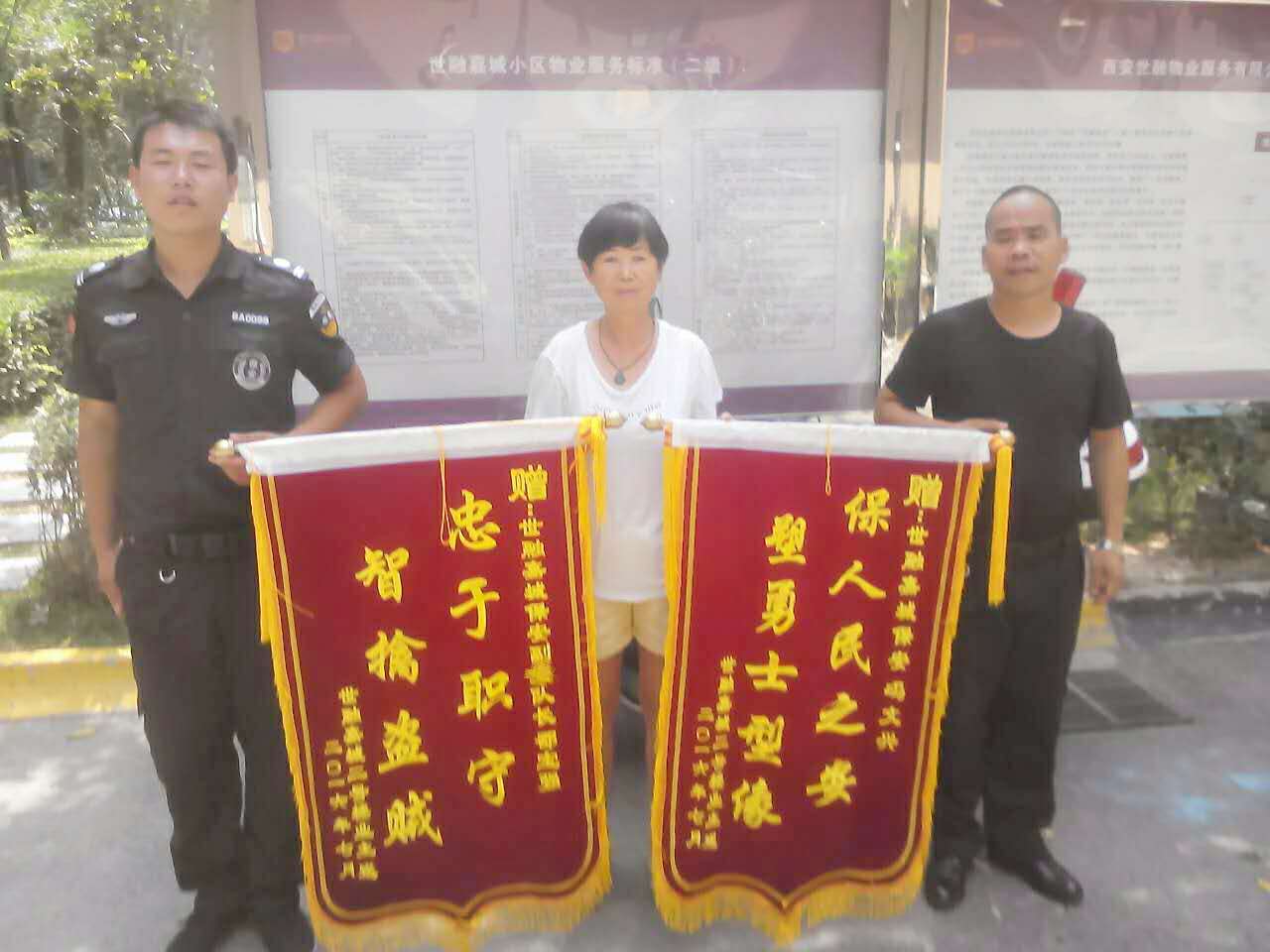 最近世融嘉城就有业主反映,近期小区内经常有传销诈骗人员的出入。世融嘉城保安副中队长邵宝强和冯文兴班长立马展开调查走访和蹲点查看,最终确定嫌疑人。2016年6月22日,在传销诈骗人员正准备实施诈骗的时候,副中队长邵宝强和冯文兴班长带领保安员积极帮助业主对付传销诈骗人员,使业主未受到经济损失,业主对保安员心存感激,特此送来“保人民之安,塑勇士形像”“忠于职守,智擒盗贼”的锦旗两面,以表感谢!