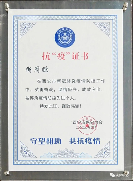 疫情期间,陕保中心根据中央、省市、行业协会有关新型冠状病毒感染疫情防控工作的指示精神和安排部署,积极采取应对措施,全体保安员全身心投入到疫情防控阻击战中。为了应对新冠肺炎疫情,西安市未雨绸缪、科学决策,用10天完成建设了一座西安“小汤山”——西安市公共卫生中心,项目建设期间急需安保人员维护施工现场秩序,在疫情防控和春节用人荒的艰难情况下,陕保中心迎难而上,勇担重任,第一时间从基层安保队伍抽调54名安保队员日夜守护在建设工地,积极配合施工单位完成医院建设,展现了陕保中心安保队伍的责任感和使命感,为整个社会疫情防控做出了积极的贡献。