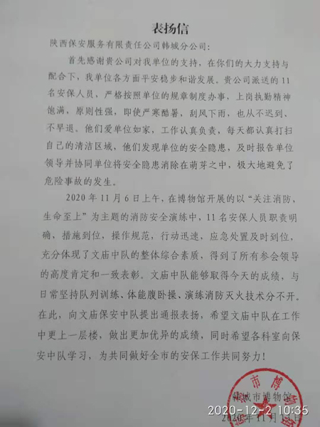 为感谢陕保中心驻韩城项目部在本次消防演练活动中的支持与配合,韩城市博物馆于11月13日特意发送表扬信。