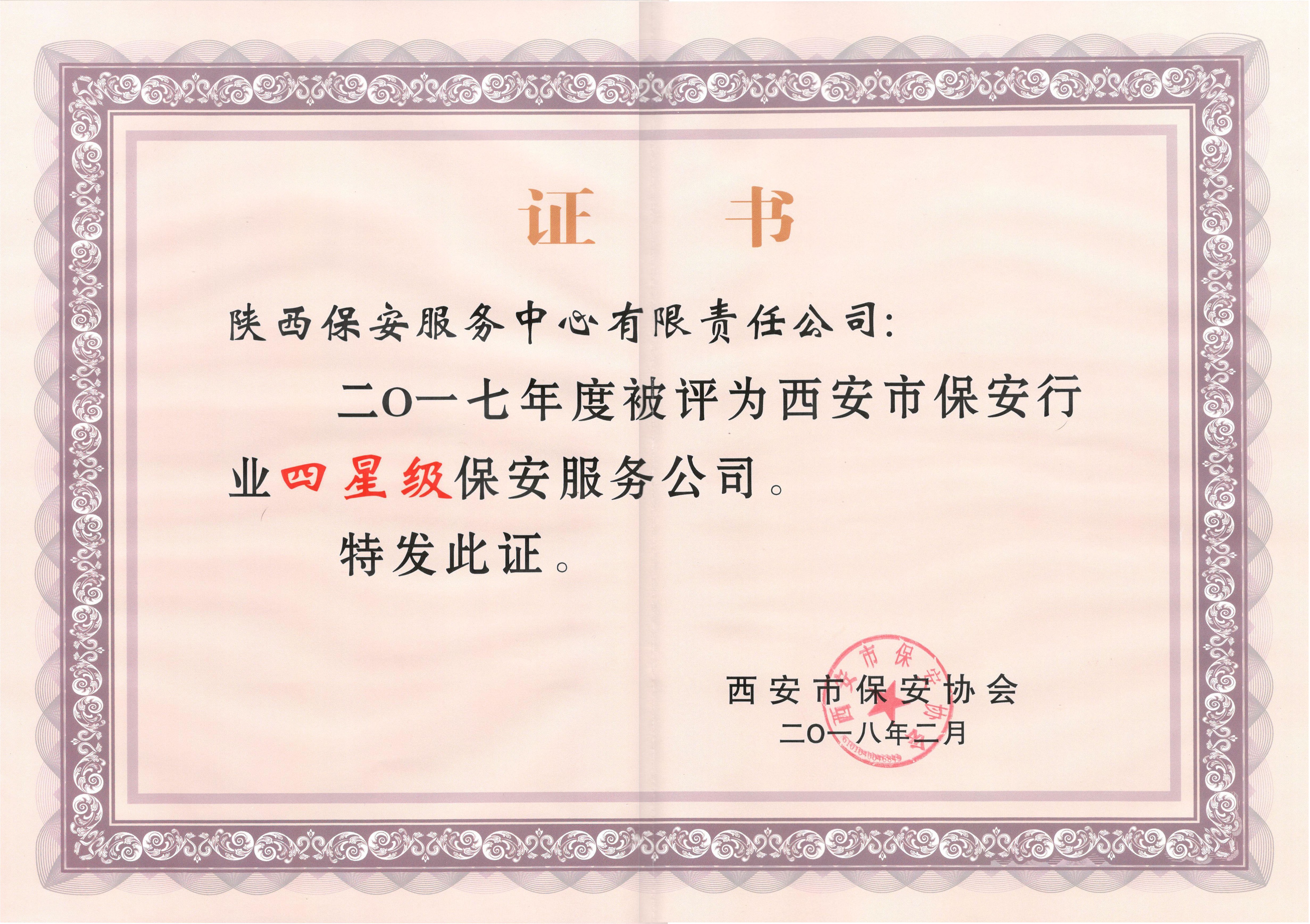 这次星级保安服务公司评定工作,从2017年11月开始至2018年2月底结束,历时近5个多月,通过考评组现场检查考评、领导小组综合评审、网上公示三个阶段的细致工作,终于于本月24日落下帷幕。陕保中心喜获“西安市四星级保安服务公司”,公司总经理崔龙在这次大会上领取了“四星级保安服务公司”的牌匾和证书。