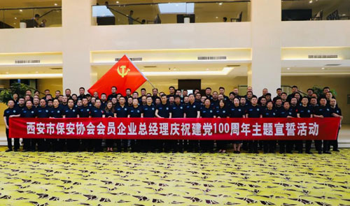 为了提高会员企业总经理的管理能力和领导艺术,促进企业经营管理健康发展,以优异成绩庆祝中国共产党成立100周年和迎接十四运的顺利开幕,西安市保安协会于2021年6月26日在陕西警官职业学院培训中心举办了“会员企业总经理业务培训班”暨“庆祝中国共产党成立100周年主题宣誓”活动,西安市公安局治安管理局保安工作管理处副处长陈顺利、陕西警官职业学院副院长张平德、社会管理系副主任刘昆丽,西安市保安协会常务副会长赵新彪、副会长兼监事长朱小波、副会长兼秘书长程保卫,副会长张金龙、窦智兴、李明辉及会员企业总经理近100人出席了主题宣誓、开班仪式和培训活动。